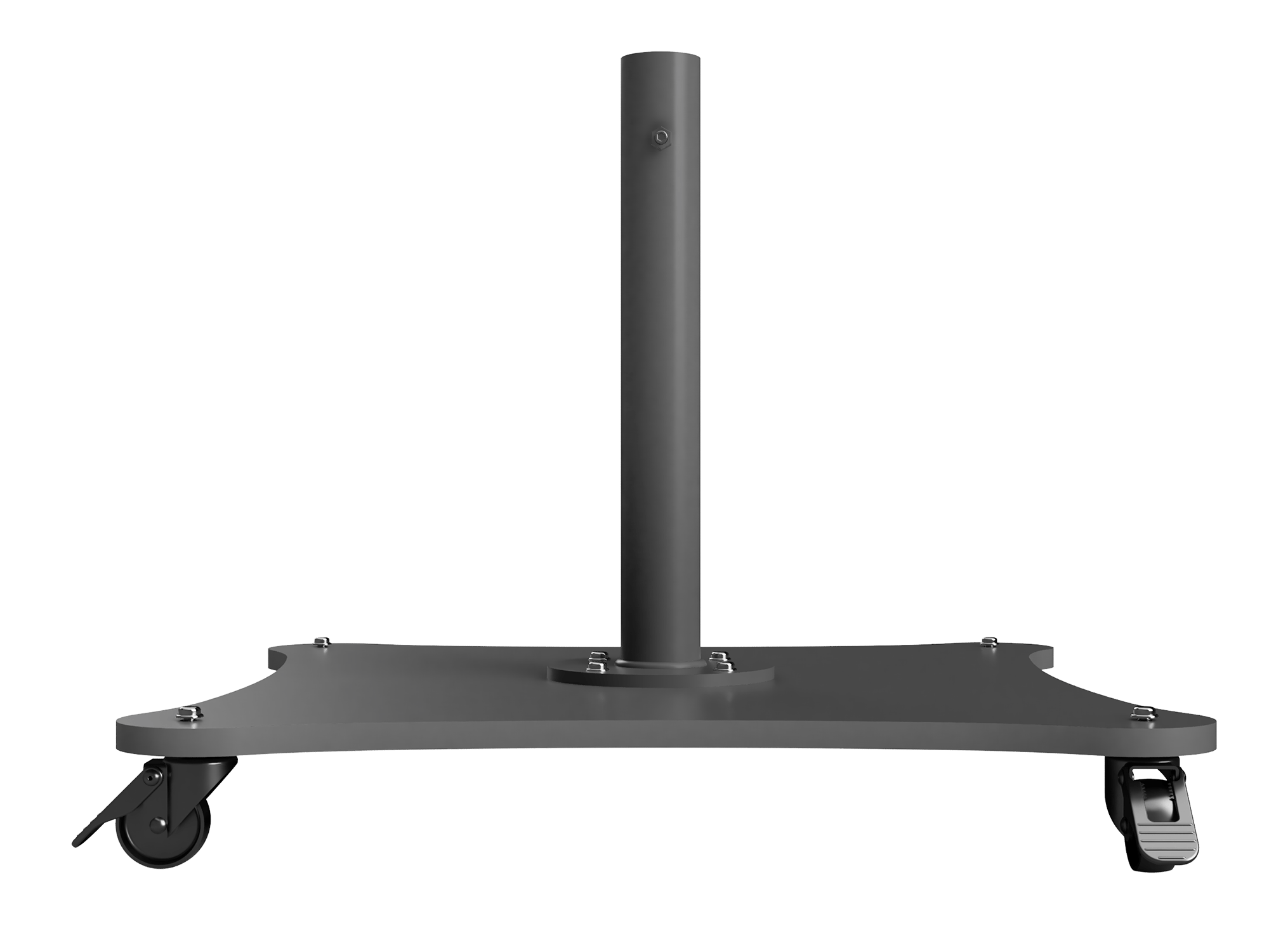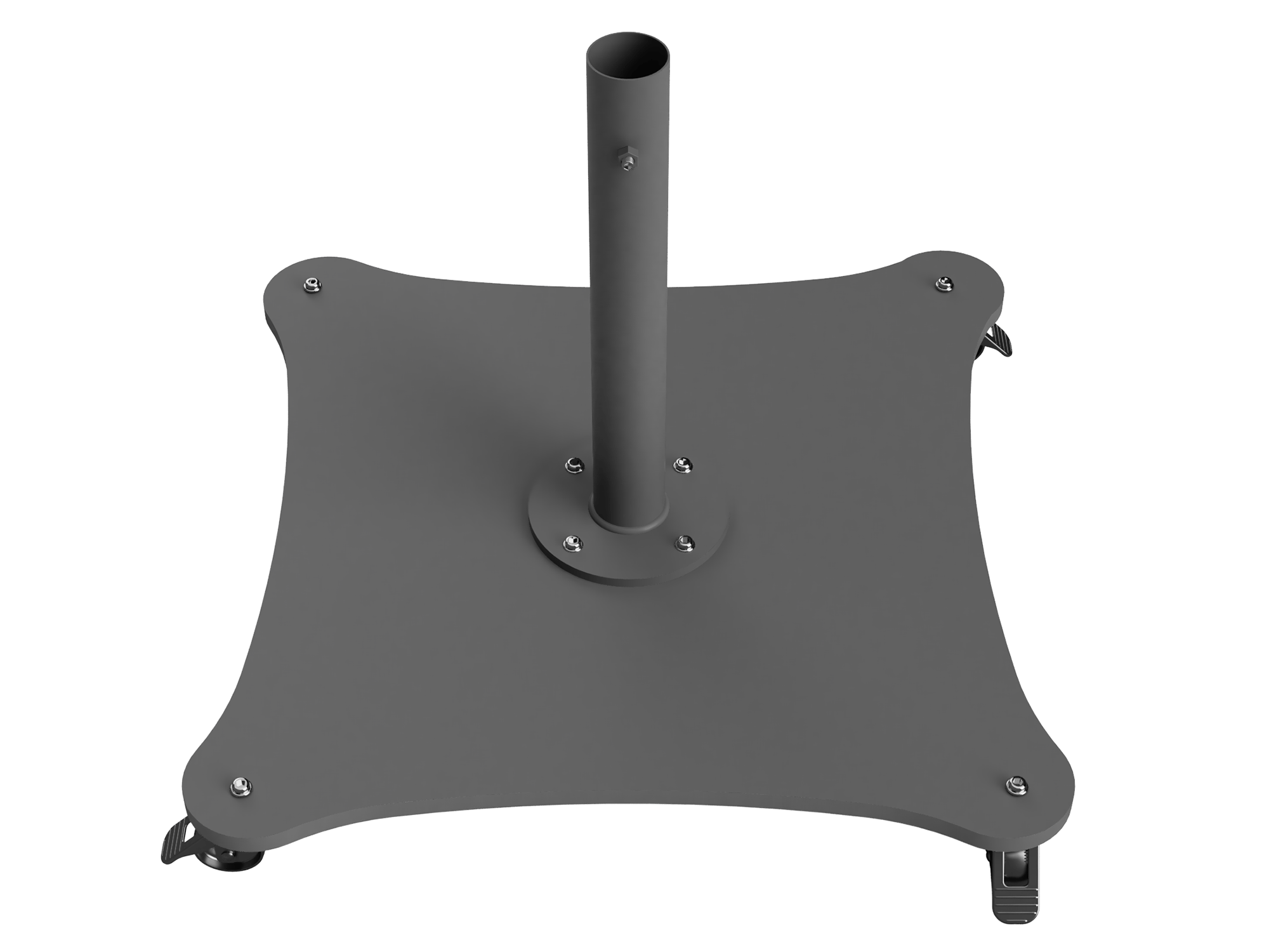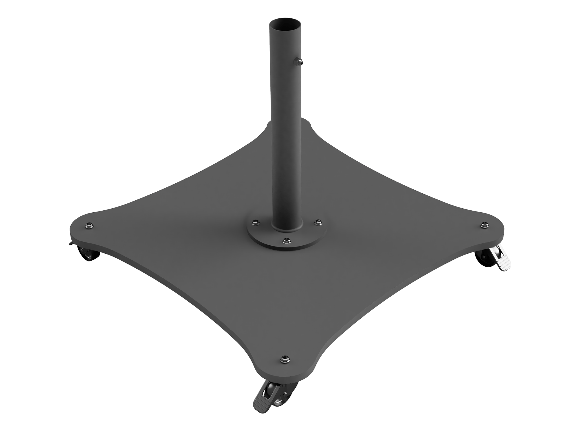 The Arcus metal umbrella base is designed with arched sides and oval corners, offering a modern look and maximum stability. This square sheet metal base features wheels for easy mobility and placement, making it ideal for various outdoor applications.