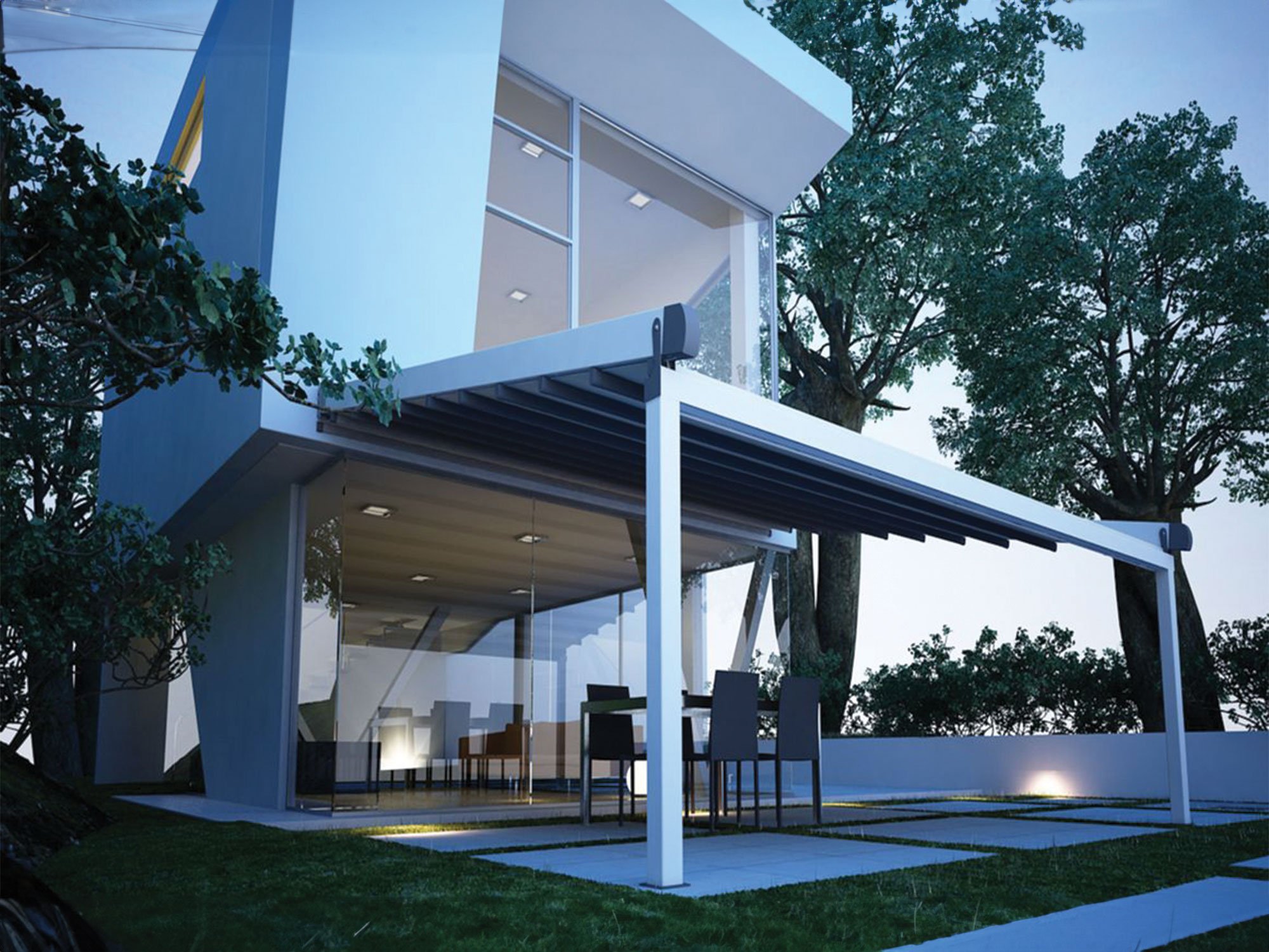 OPUS: The base model with elegant design, integrated gutter, and columns with hidden drainage. Additionally, there is an extra fascia covering that conceals the guides.