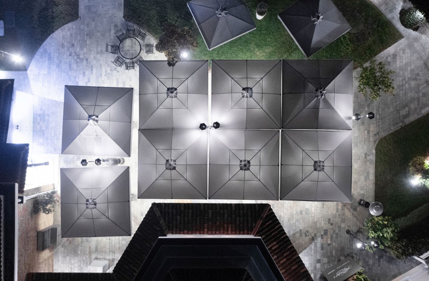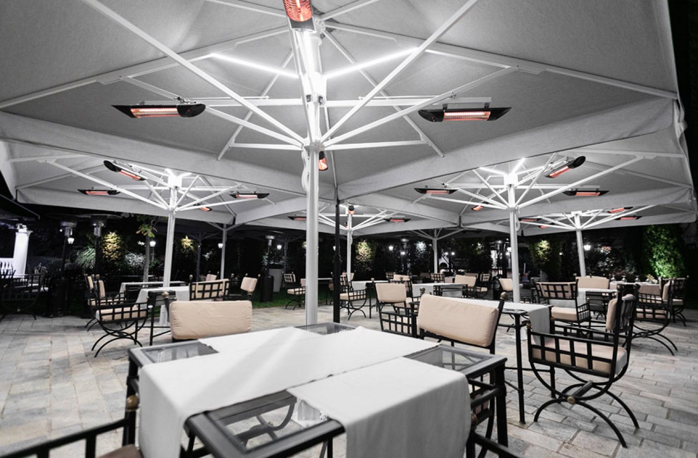Τhe outdoor space takes on a new dimension thanks to the sophisticated Queen umbrellas with integrated lighting and heaters.