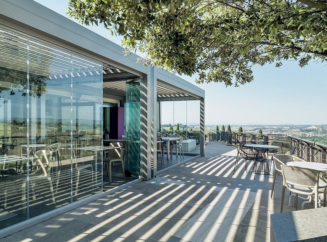 The bioclimatic pergola offers maximum design flexibility, with the ability to create personalized solutions and multiple combinations that adapt to the specific needs of each space. It is the ideal choice for those looking to combine high aesthetics with practicality, whether for private homes or commercial spaces in hospitality and dining.