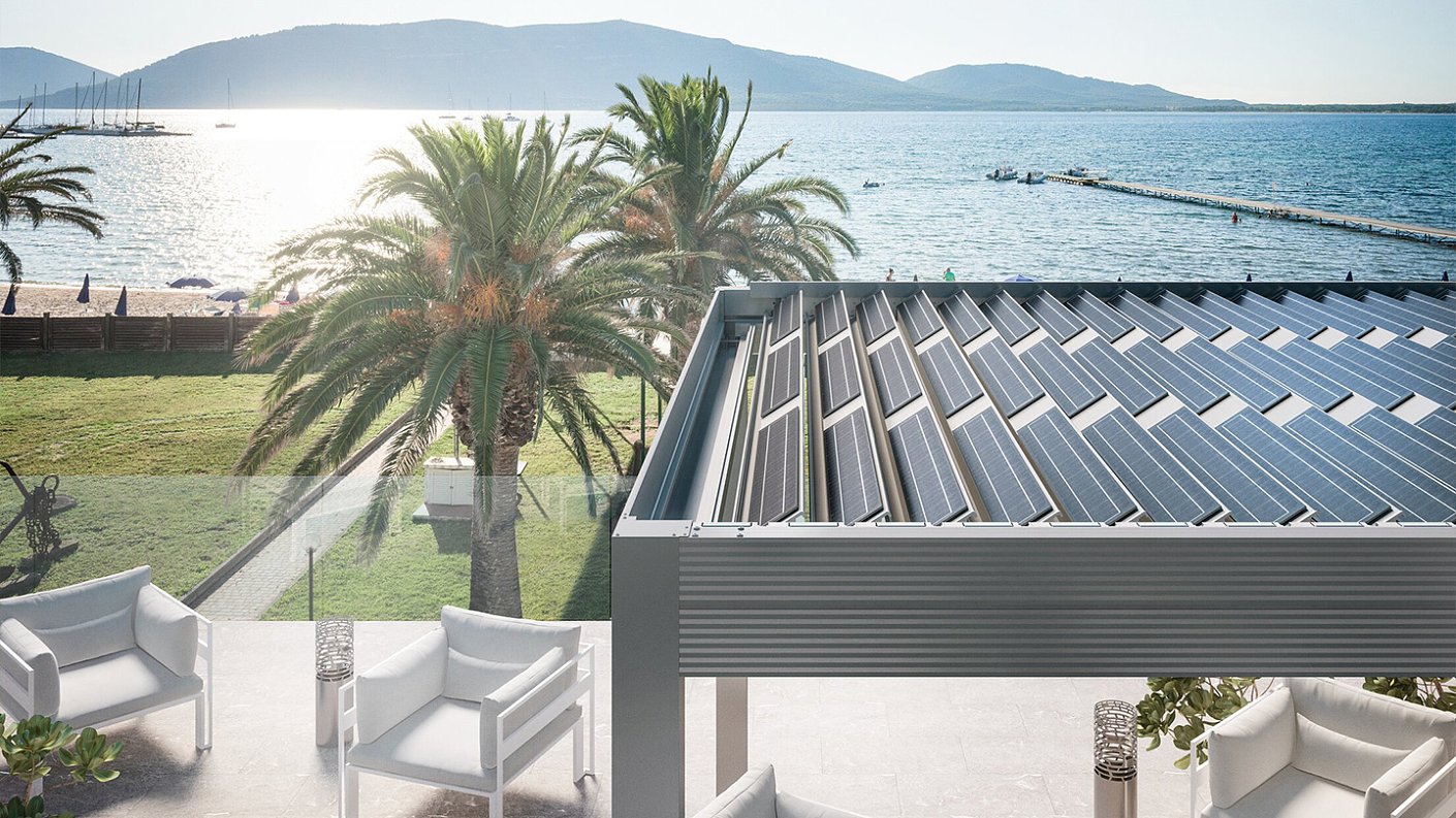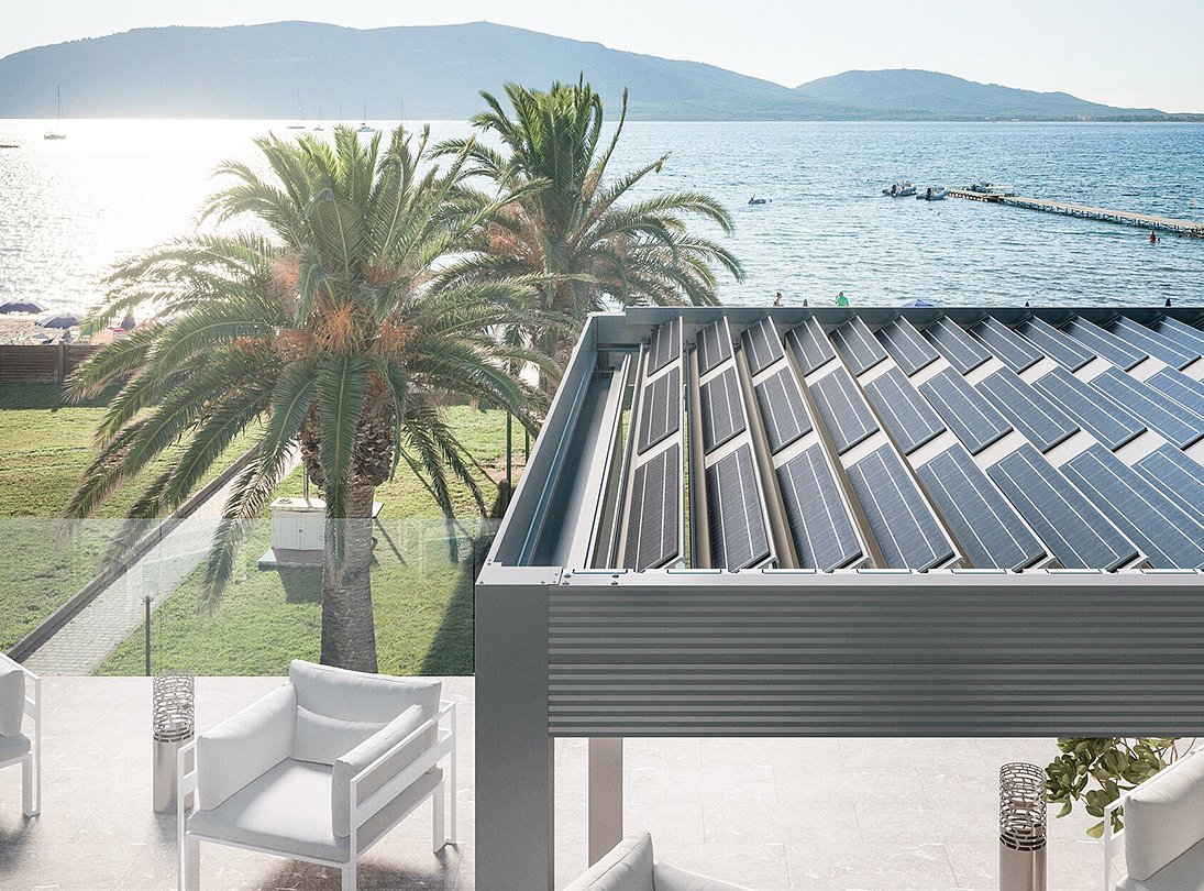 The louvers of the pergola are designed to incorporate solar panels, transforming the pergola into a source of renewable energy. This innovation allows for the generation of electricity, making the pergola eco-friendly and energy-efficient, while also providing shading and protection from the sun.