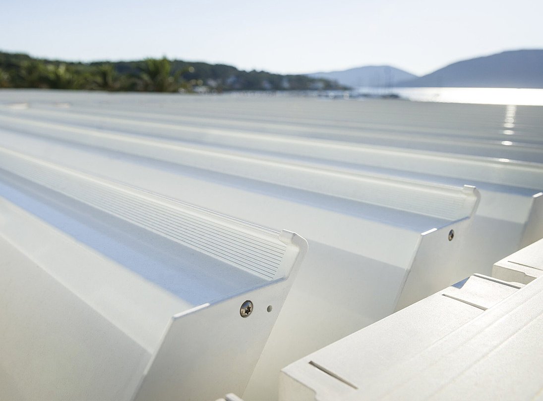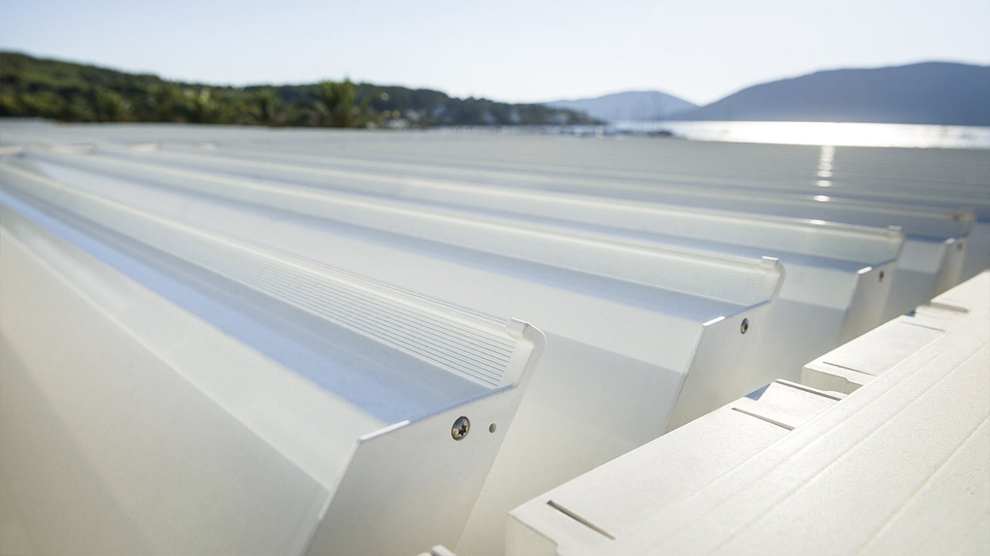 The aluminum louvers that form the cover feature motorized movement and can rotate from the initial closed position, ensuring excellent watertightness, within a range of 0° to 115°.