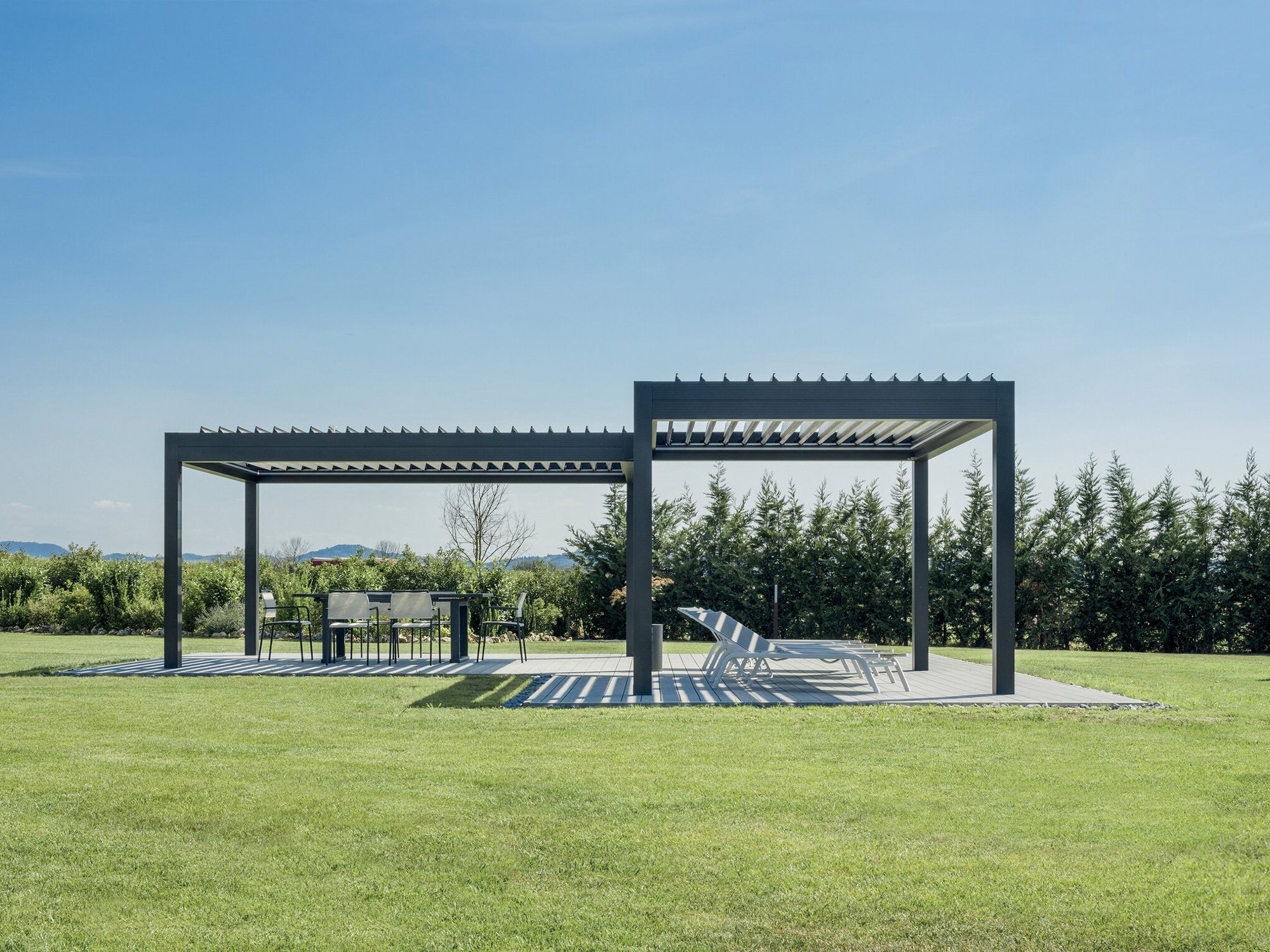 The Twist pergola can be customized to fit any outdoor space, from private gardens to commercial establishments, offering ultimate flexibility. With the ability to adjust the angle of the louvers, users have full control over solar radiation and lighting, while the rain protection ensures continuous use of the space in all weather conditions.