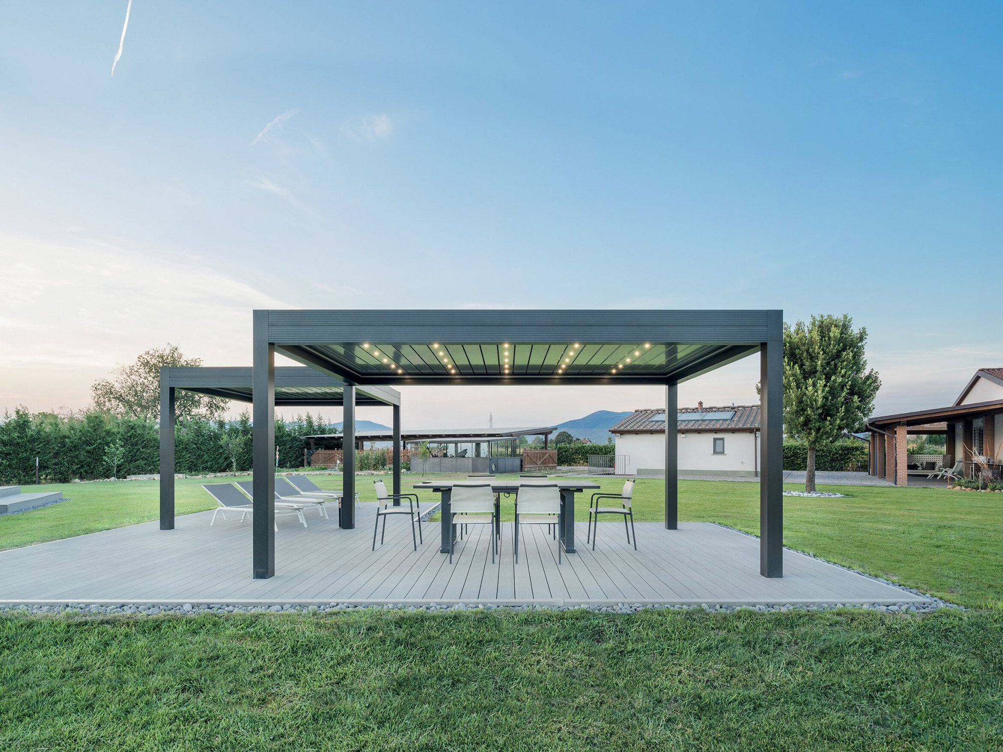 The pergola features built-in LED lighting that enhances the space and creates a unique atmosphere during the evening hours. The lighting options include linear LEDs placed in the louvers or the frame, providing uniform and subtle illumination that adapts to the specific needs.