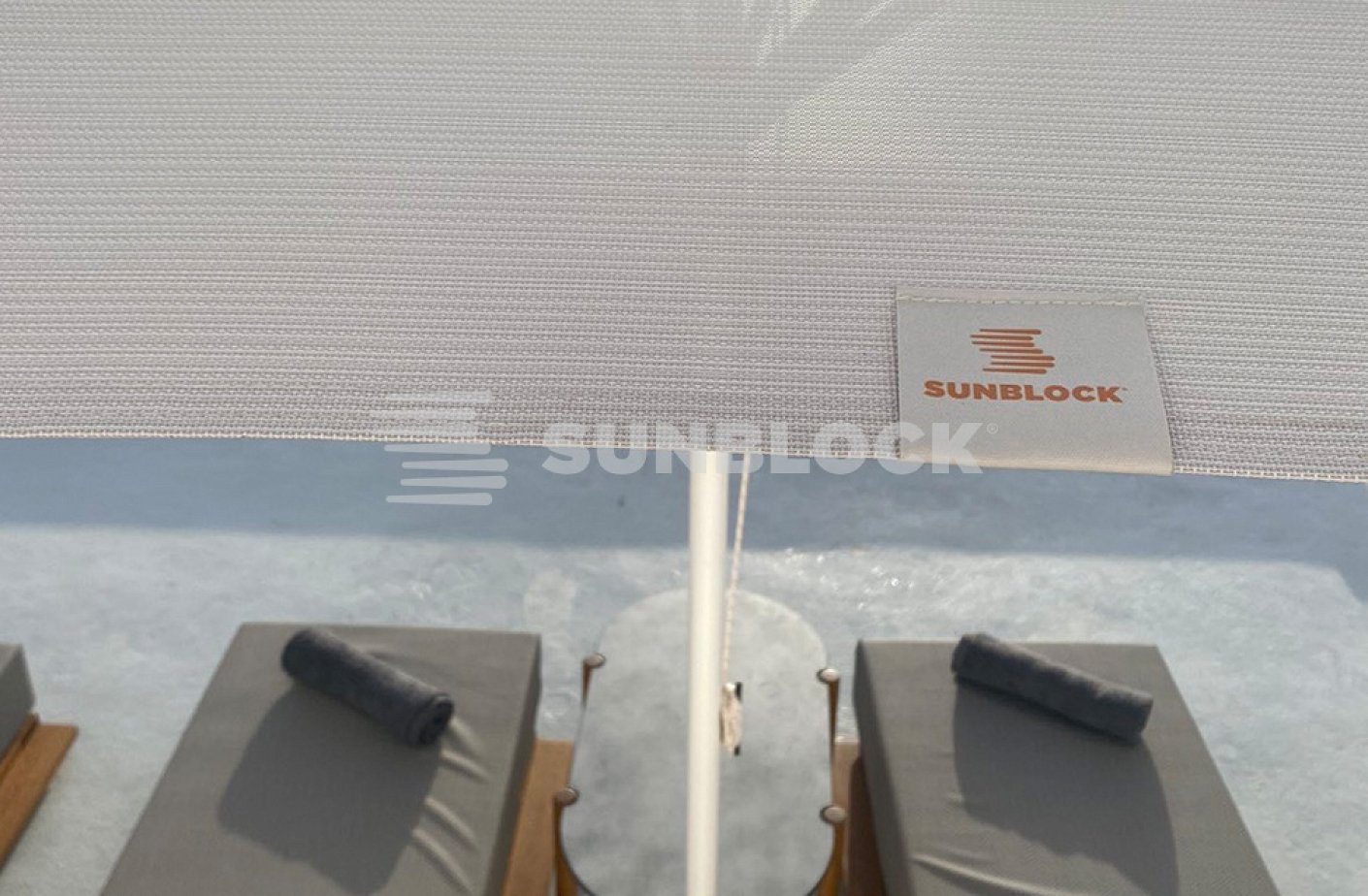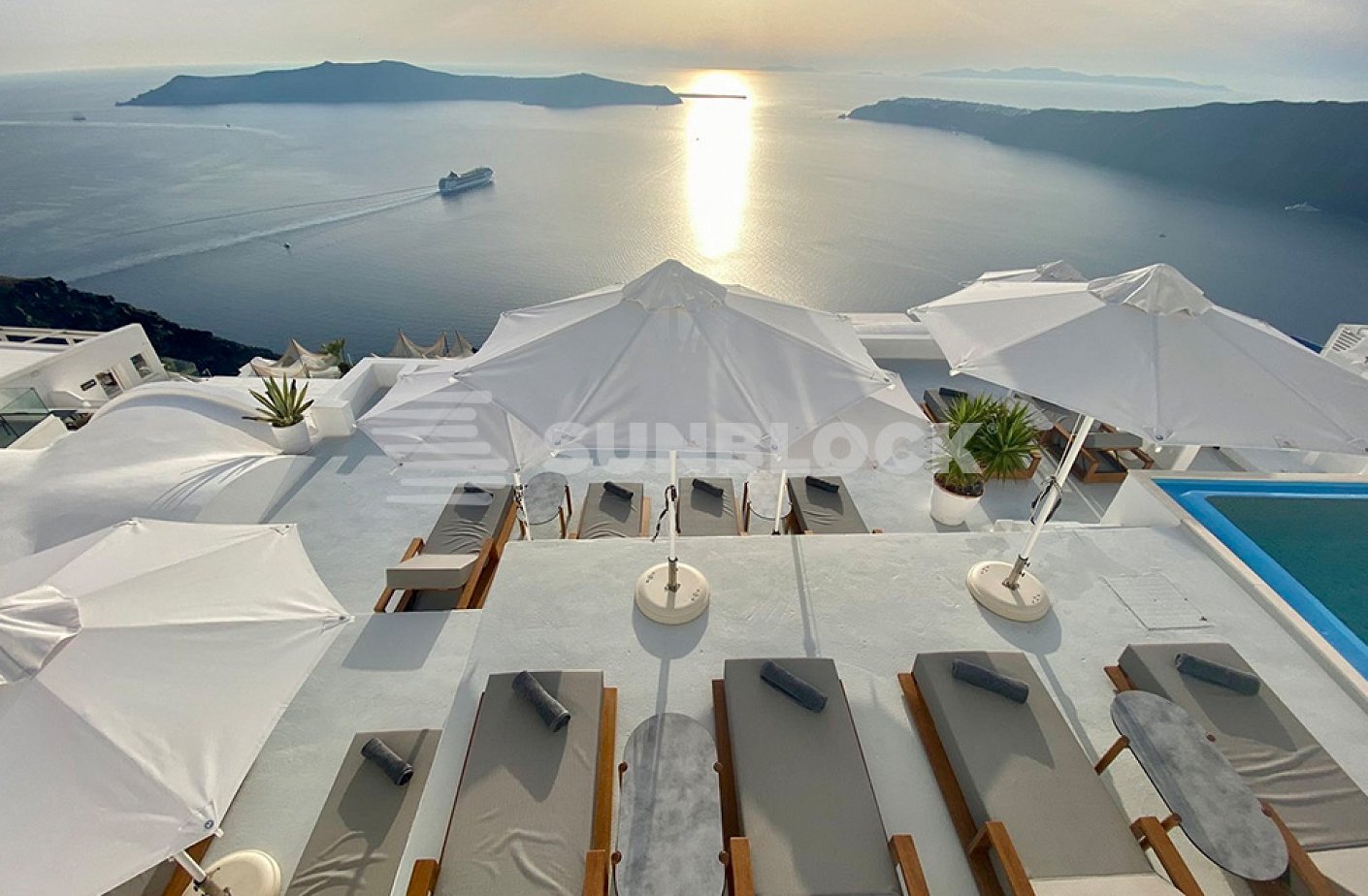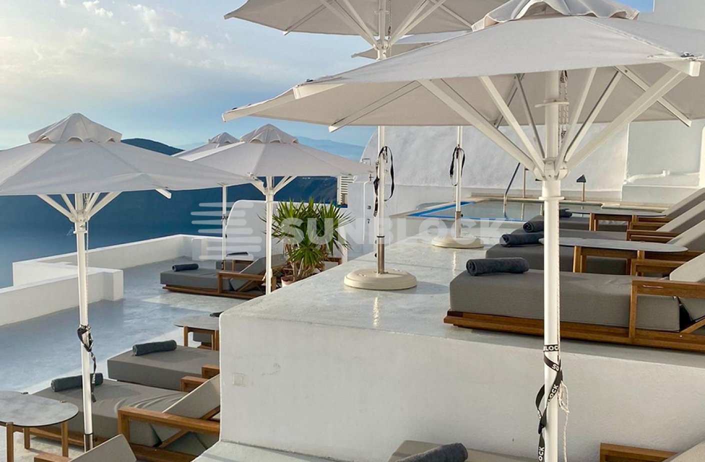Η επιλογή των ομπρελών CLASSIC για την πισίνα του ξενοδοχείου στη Σαντορίνη αναδεικνύει την εκλεπτυσμένη αισθητική του χώρου.