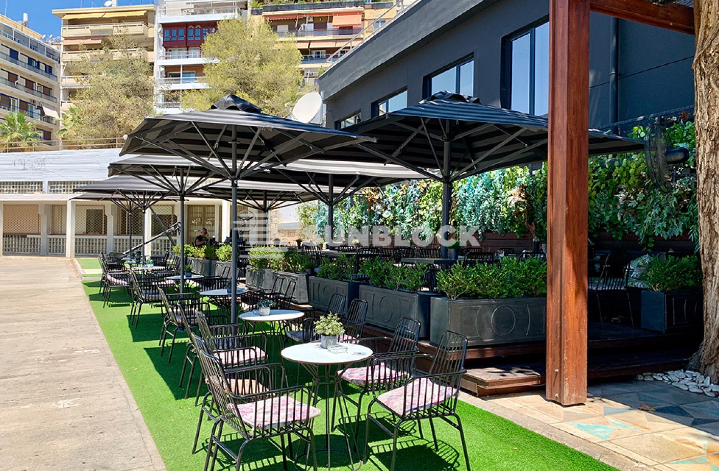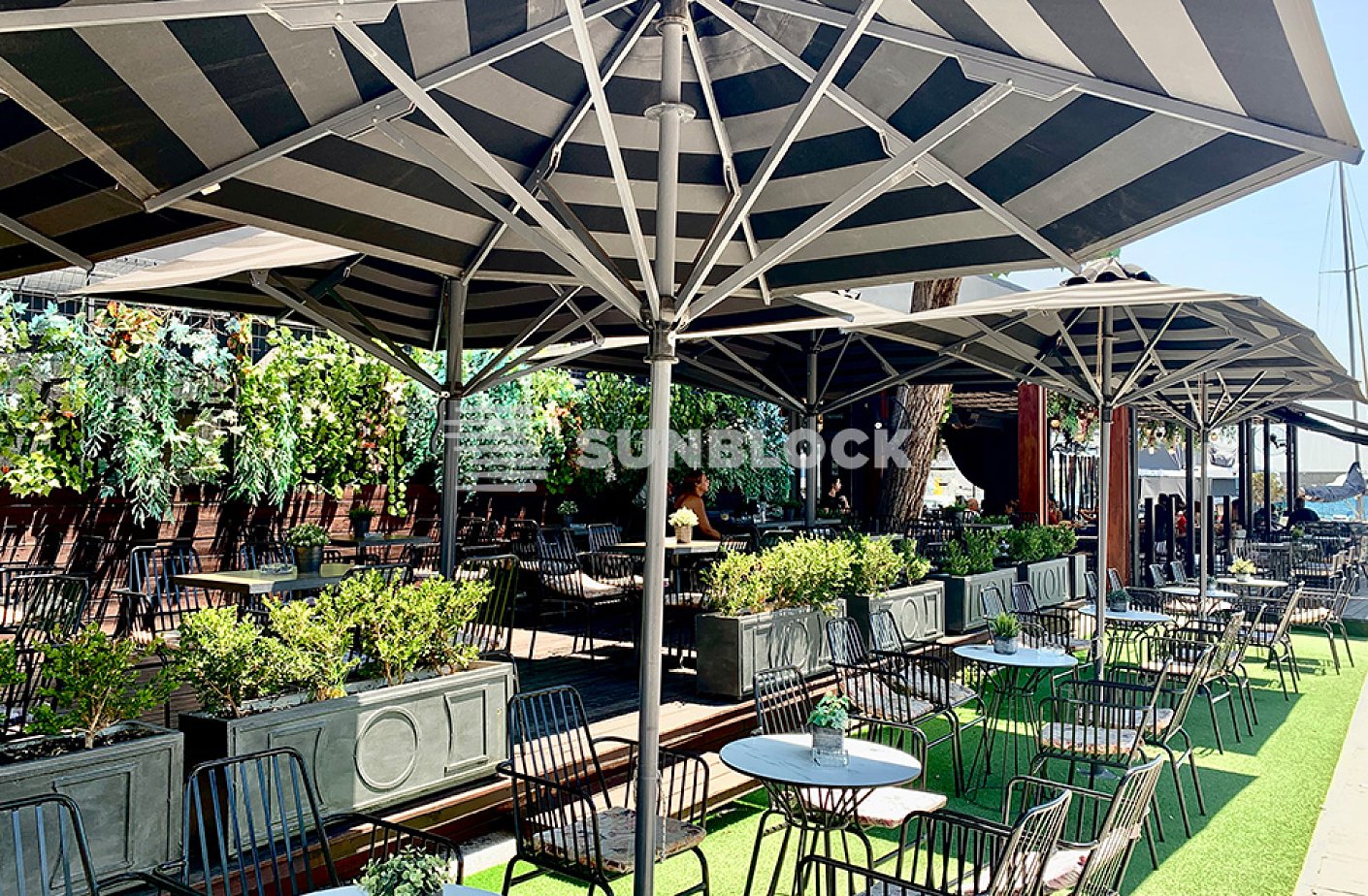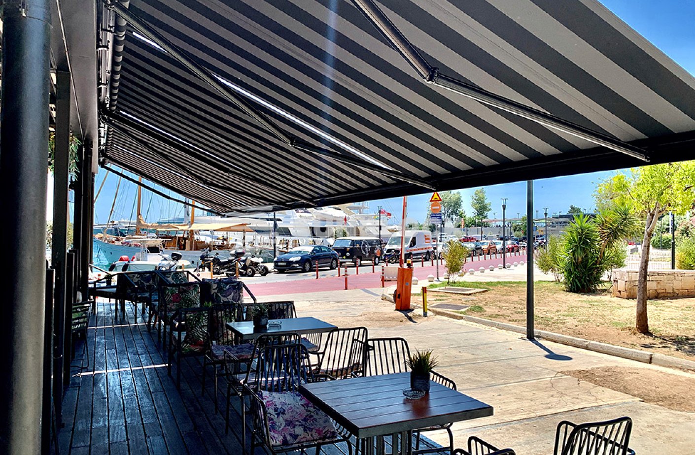 Στο κατάστημα All Day στη Μαρίνα Ζέας στον Πειραιά έχουμε τοποθετήσει διάφορες ομπρέλες και τέντες για να δημιουργήσουμε έναν άνετο και προστατευμένο χώρο. Στον εσωτερικό χώρο έχουμε επιλέξει μεγάλες τηλεσκοπικές ομπρέλες χωρίς κολόνες, προσφέροντας ευρύχωρο και ελεύθερο περιβάλλον. Στην εξωτερική περιοχή, έχουμε τοποθετήσει κλασικές ομπρέλες που προσφέρουν αποτελεσματική προστασία από τον ήλιο και τις καιρικές συνθήκες. Επιλέξαμε ριγέ ύφασμα για να δώσουμε μια ιδιαίτερη αισθητική πινελιά και να τονίσουμε την εξατομίκευση του χώρου μας. Επιπλέον, έχουμε εγκαταστήσει τέντες με βραχίονες και στέγαστρο, προσφέροντας άνεση και προστασία σε κάθε καιρική συνθήκη. Αυτή η διάταξη αποδεικνύει την προσοχή μας στη λεπτομέρεια και τη δέσμευσή μας να προσφέρουμε μια ολοκληρωμένη εμπειρία στους πελάτες μας, συνδυάζοντας λειτουργικότητα και αισθητική.
