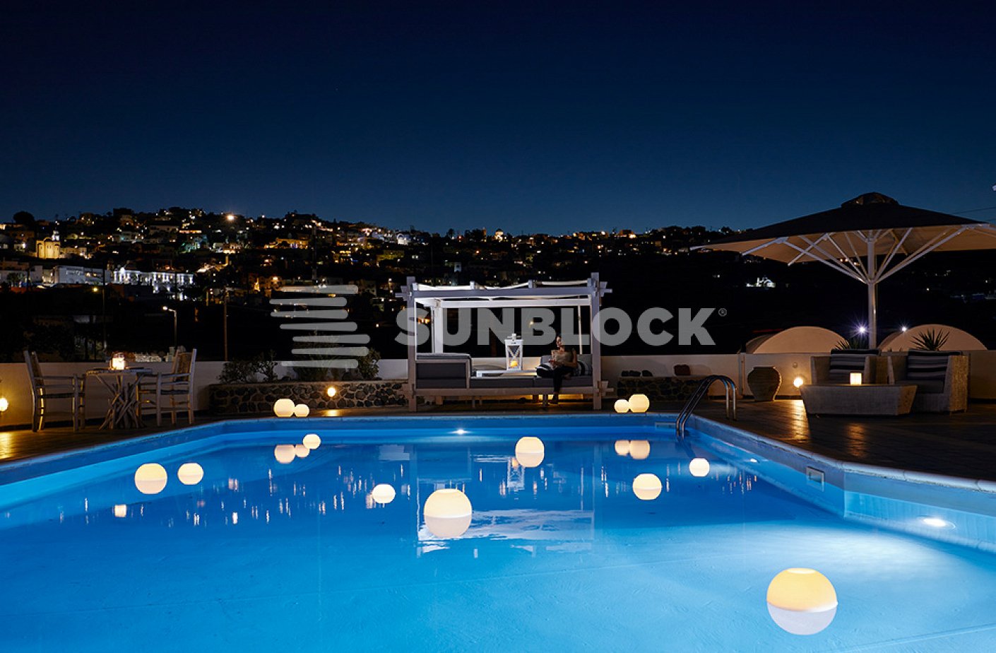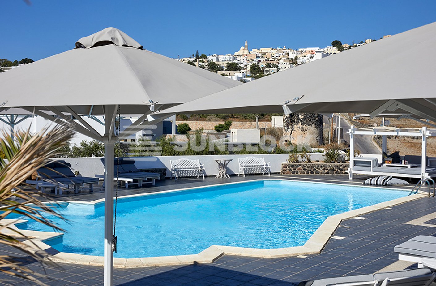 Για τη σκίαση του χώρου της πισίνας, επιλέχθηκαν οι επαγγελματικές ομπρέλες GRAND της SUNBLOCK — σχεδιασμένες να ανταποκρίνονται ακόμη και στις πιο απαιτητικές καιρικές συνθήκες. Στη συγκεκριμένη τοποθεσία, οι άνεμοι μπορούν να φτάσουν έως και 11 Beaufort, γι’ αυτό και ήταν απαραίτητη μια λύση με κορυφαία αντοχή και αξιοπιστία.